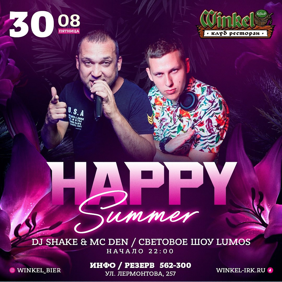 30 Августа в пятницу «Happy Summer» в компании профессионалов своего дела Dj Shake&Mc Den, которые не дадут тебе скучать в этот вечер!