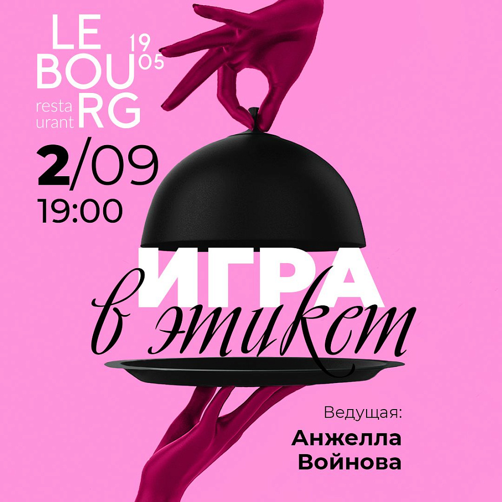 2 сентября, в четверг, здесь устроят игру в этикет - цифровой, винный, деловой, светский, столовый и так далее - под чутким руководством специалиста по этикету, резидента Международной Ассоциации Консультантов по этикету и коммуникациям Анжеллы Войновой. Естественно с велкам-дринком, призами и музыкальным сопровождением.