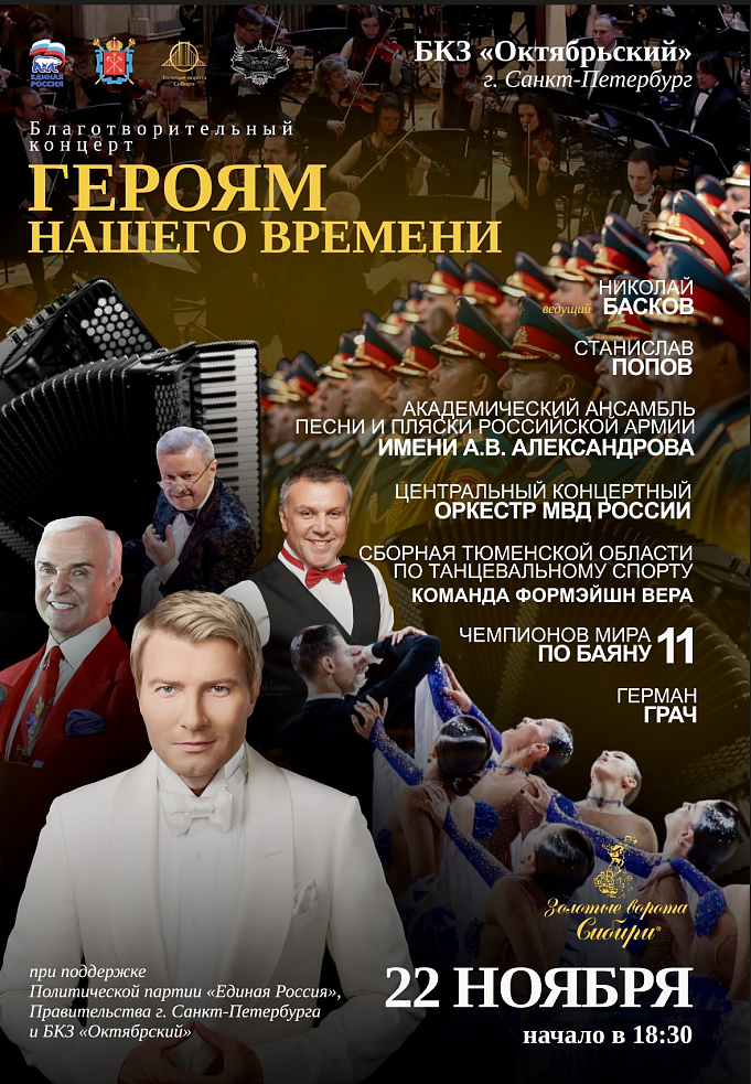 22.11.24 г. в Большом концертном зале «Октябрьский» состоится 22-ый благотворительный концерт Федерального проекта «Героям нашего времени», организованный Фондом «Золотые ворота Сибири», при поддержке Всероссийской политической партии «Единая Россия», Губернатора С-Петербурга Беглова А.Д. и БКЗ «Октябрьский»