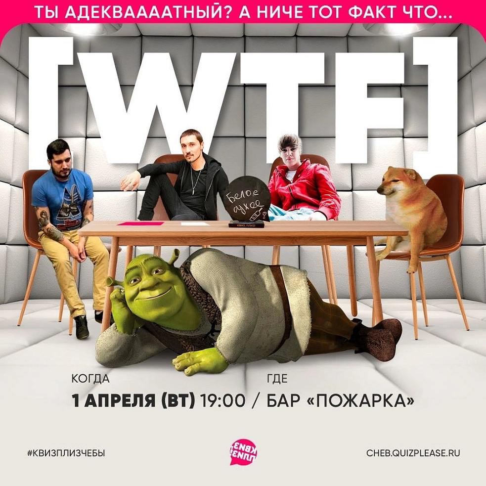 Это чё вообще? Вотафак? К чёрту правила, к чёрту сбалансированные раунды — только дичь, только абсурд и самые странные механики. Почему? Потому что мы так захотели, вот почему. Давно хотели сказать, что этот Квиз, плиз! офигел вообще, но не было повода? Ну вот вам повод. Раунды, которые не вписываются в нормы. Вопросы, которые не вписываются в здравый смысл. Ведущий, которые не вписывается в двери (но это не точно). А в остальном — всё привычно: 2,5 часа, в команде может быть от 2 до 9 человек.