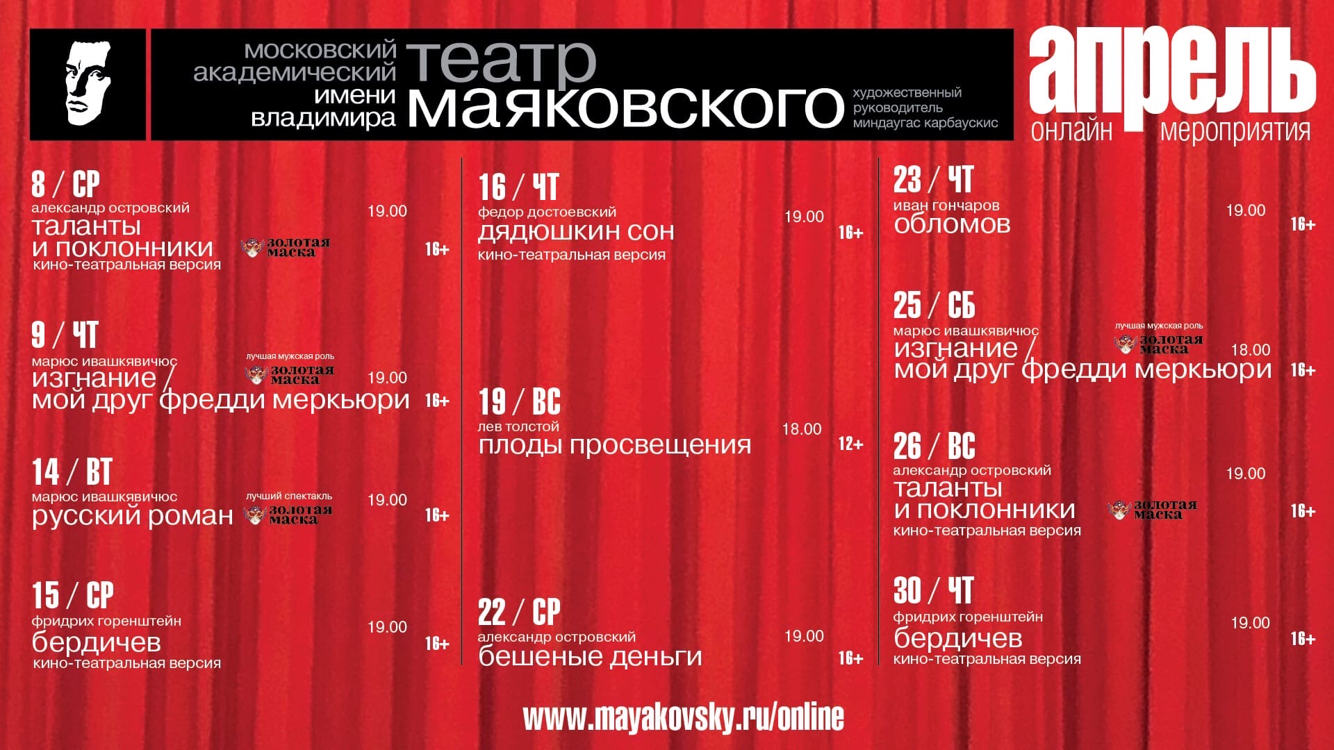 Театр им. Маяковского бесплатно покажет свои спектакли «Плоды просвещения», «Изгнание / Мой друг Фредди Меркьюри», «Русский роман», «Таланты и поклонники», «Обломов», «Бешеные деньги», «Бердичев» и «Дядюшкин сон». Начало всех трансляций в 19:00 на сайте театра.