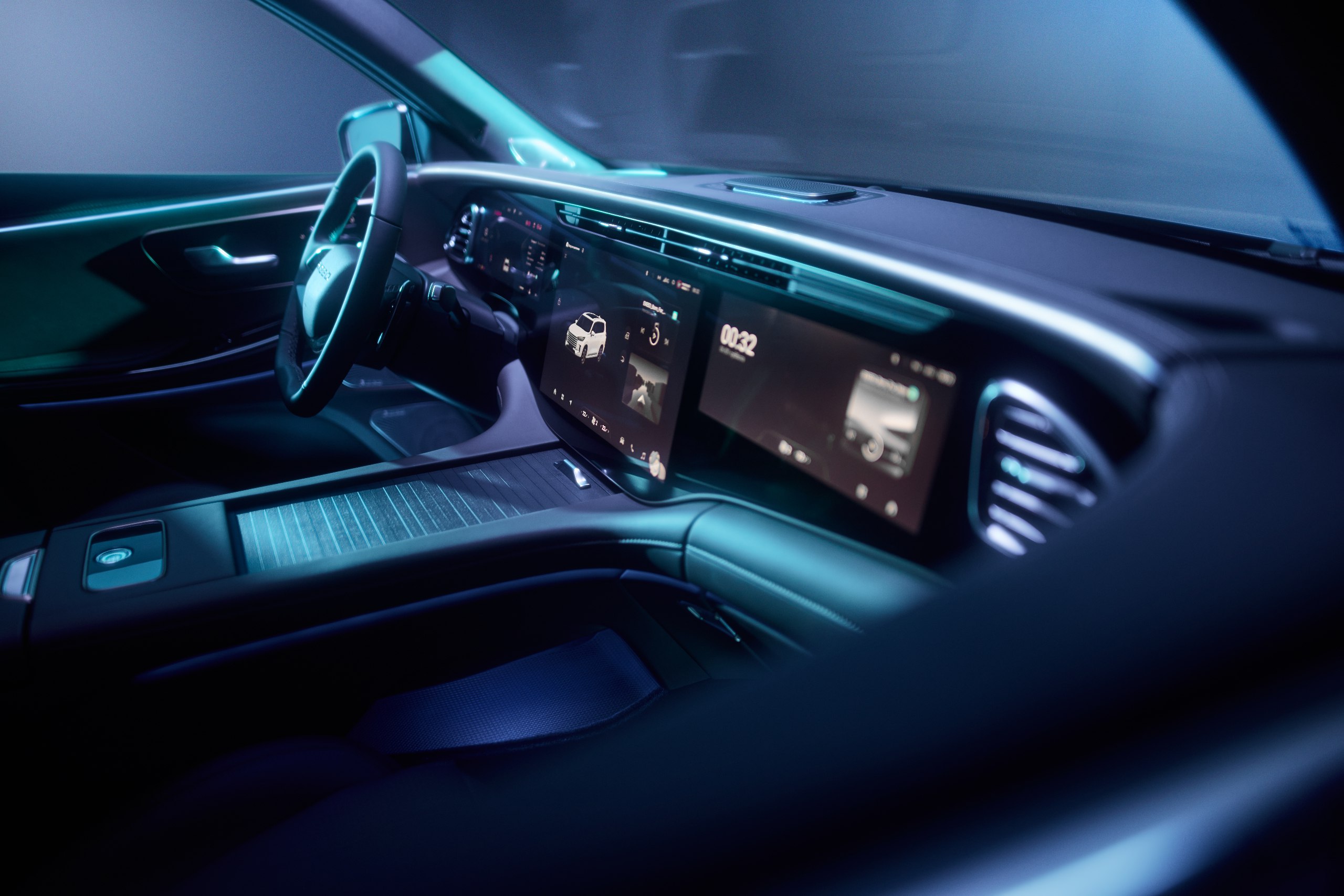 В салоне вас встречает не просто набор экранов, а цельный цифровой интерфейс. Три дисплея объединены в изогнутую панель, напоминающую штурвал современного космического корабля. Всё работает быстро и без лагов благодаря мощному процессору Qualcomm Snapdragon 8155 — такому же, как в последних электрокарах и флагманских телефонах.