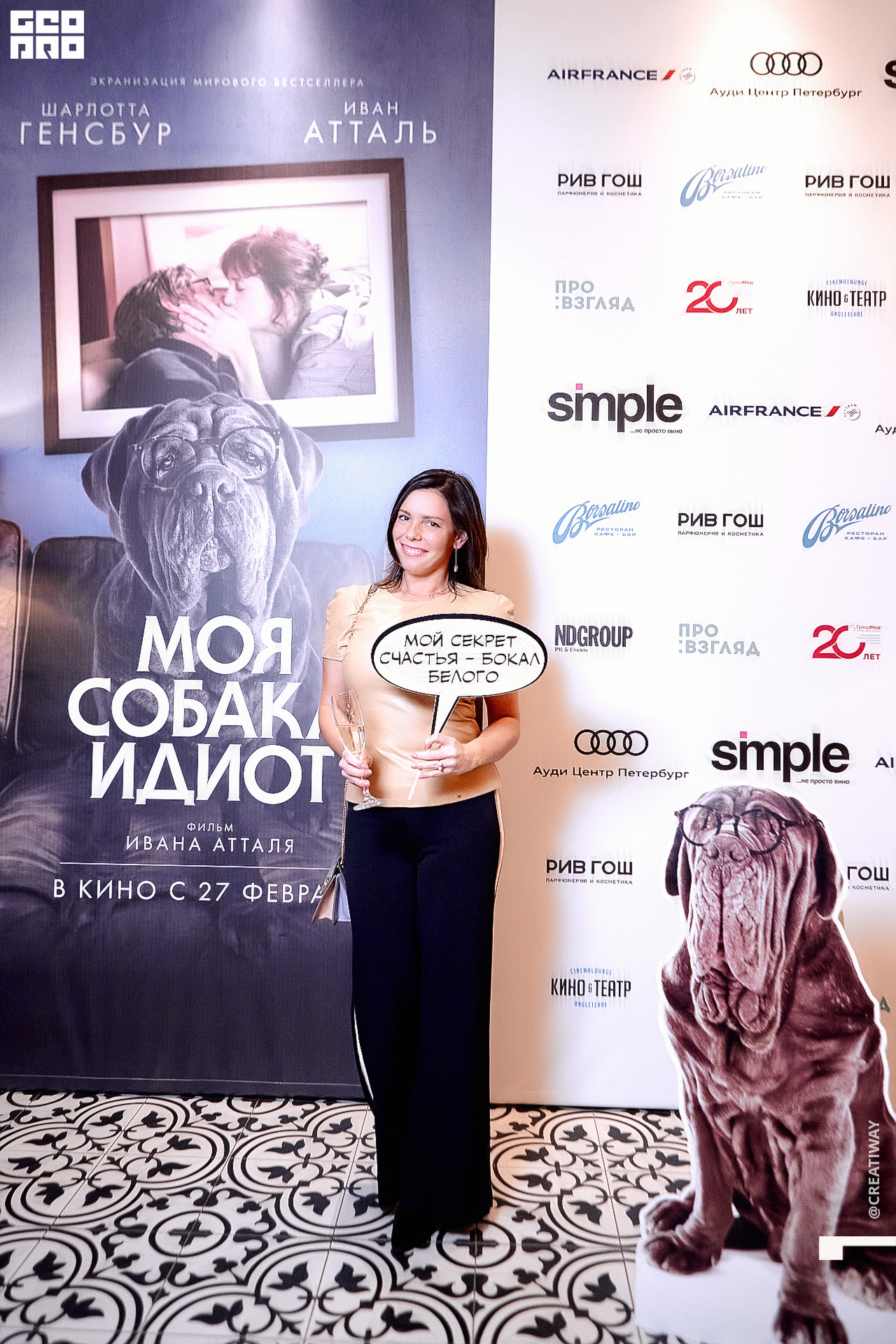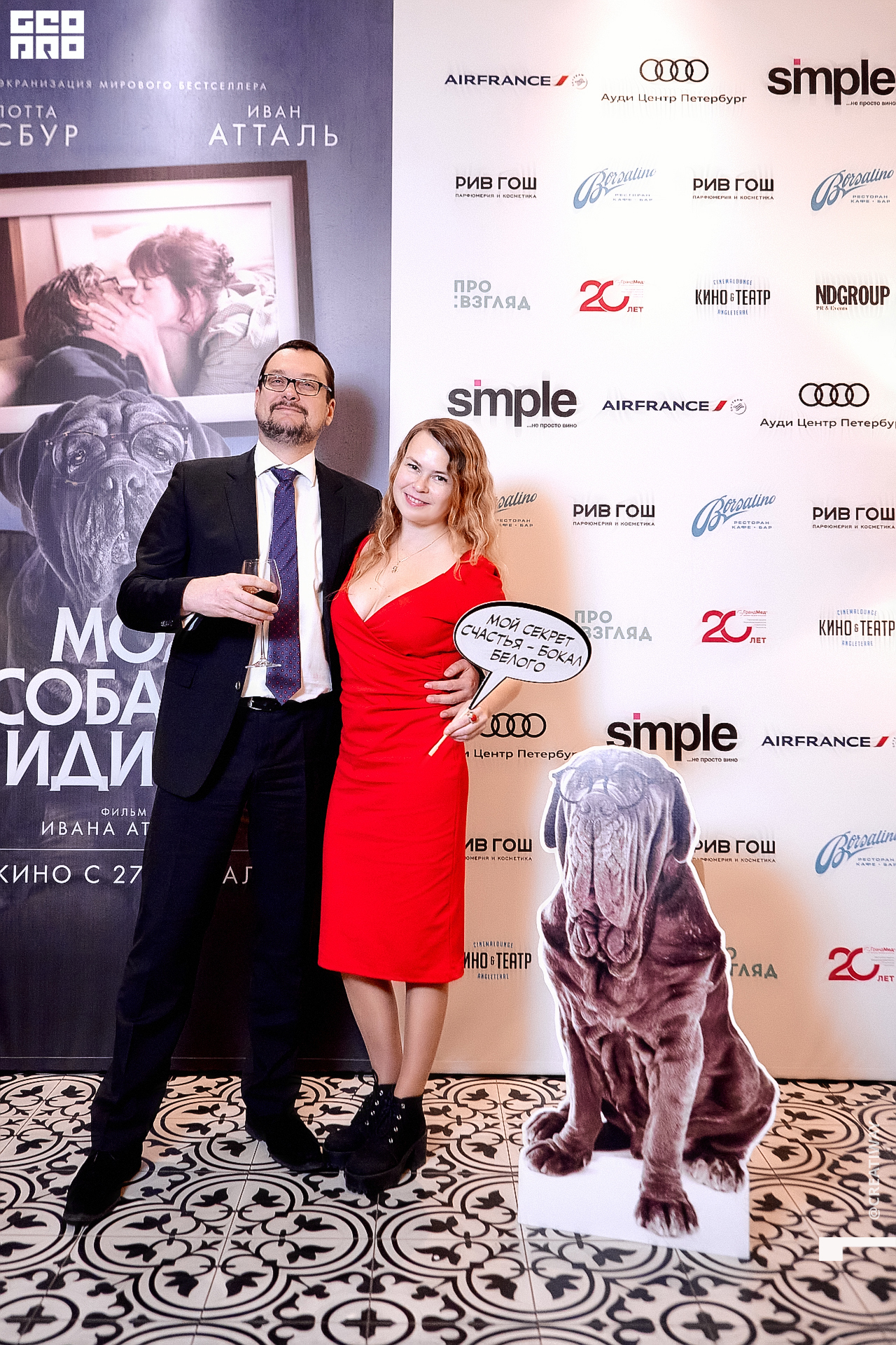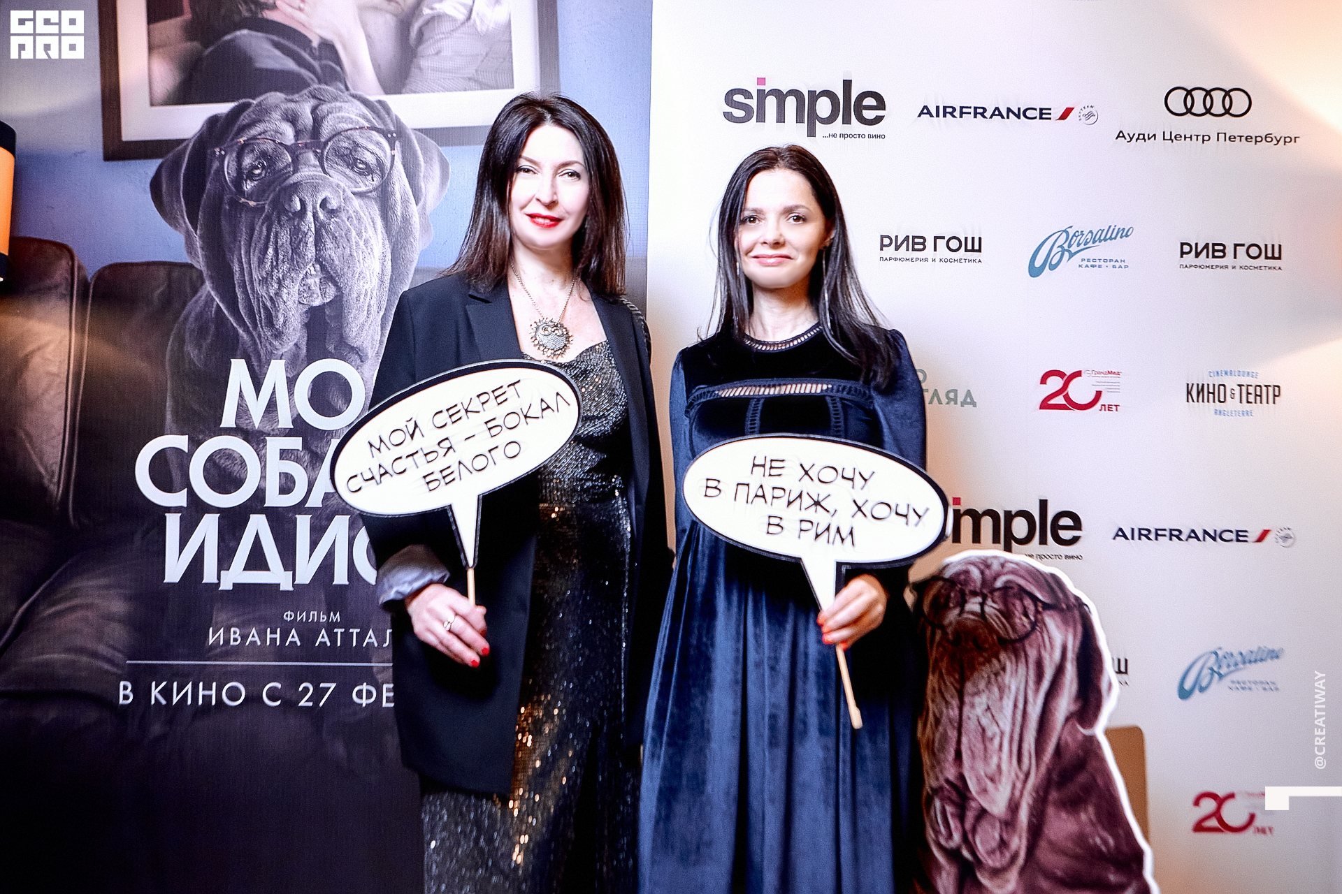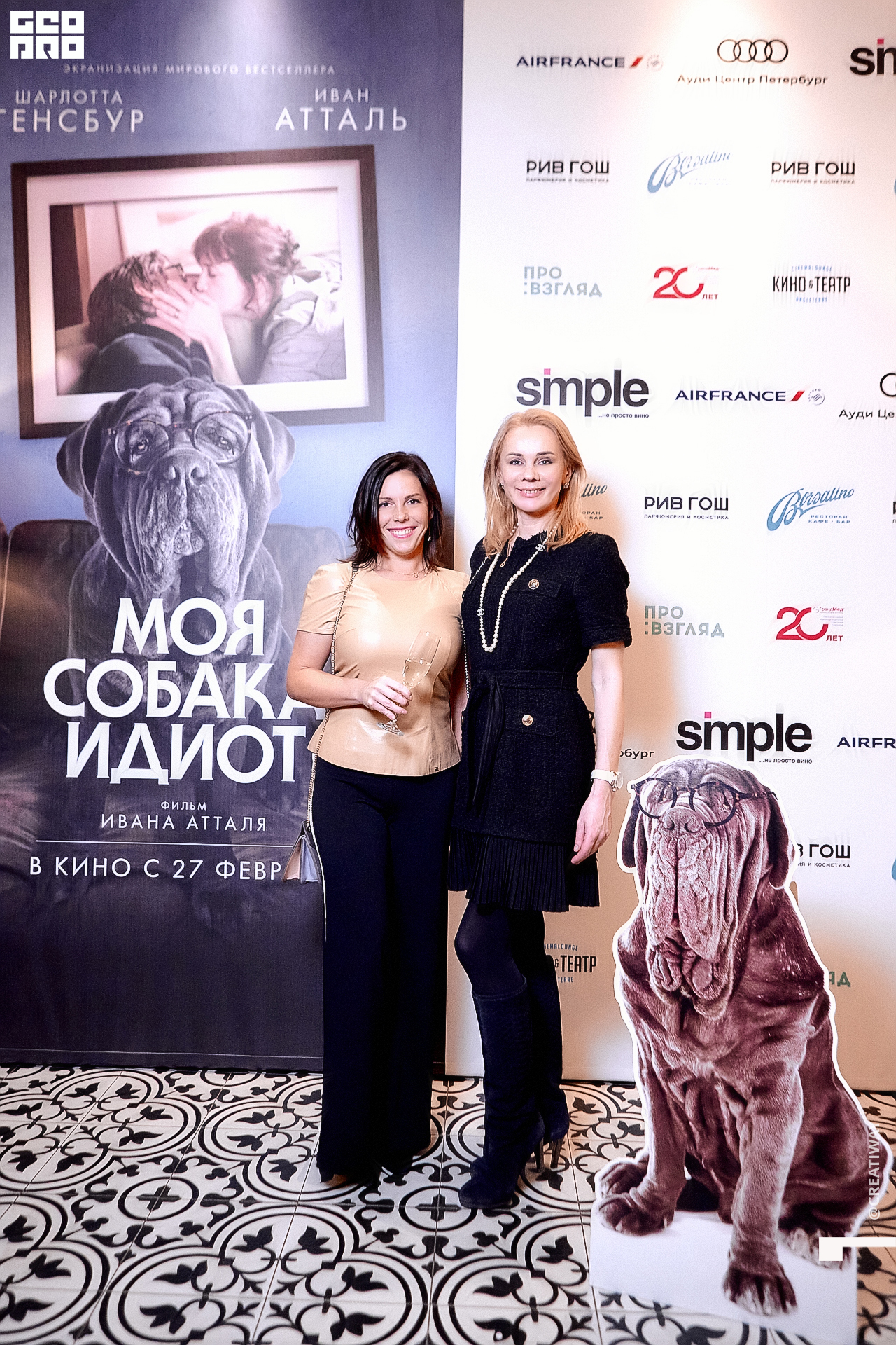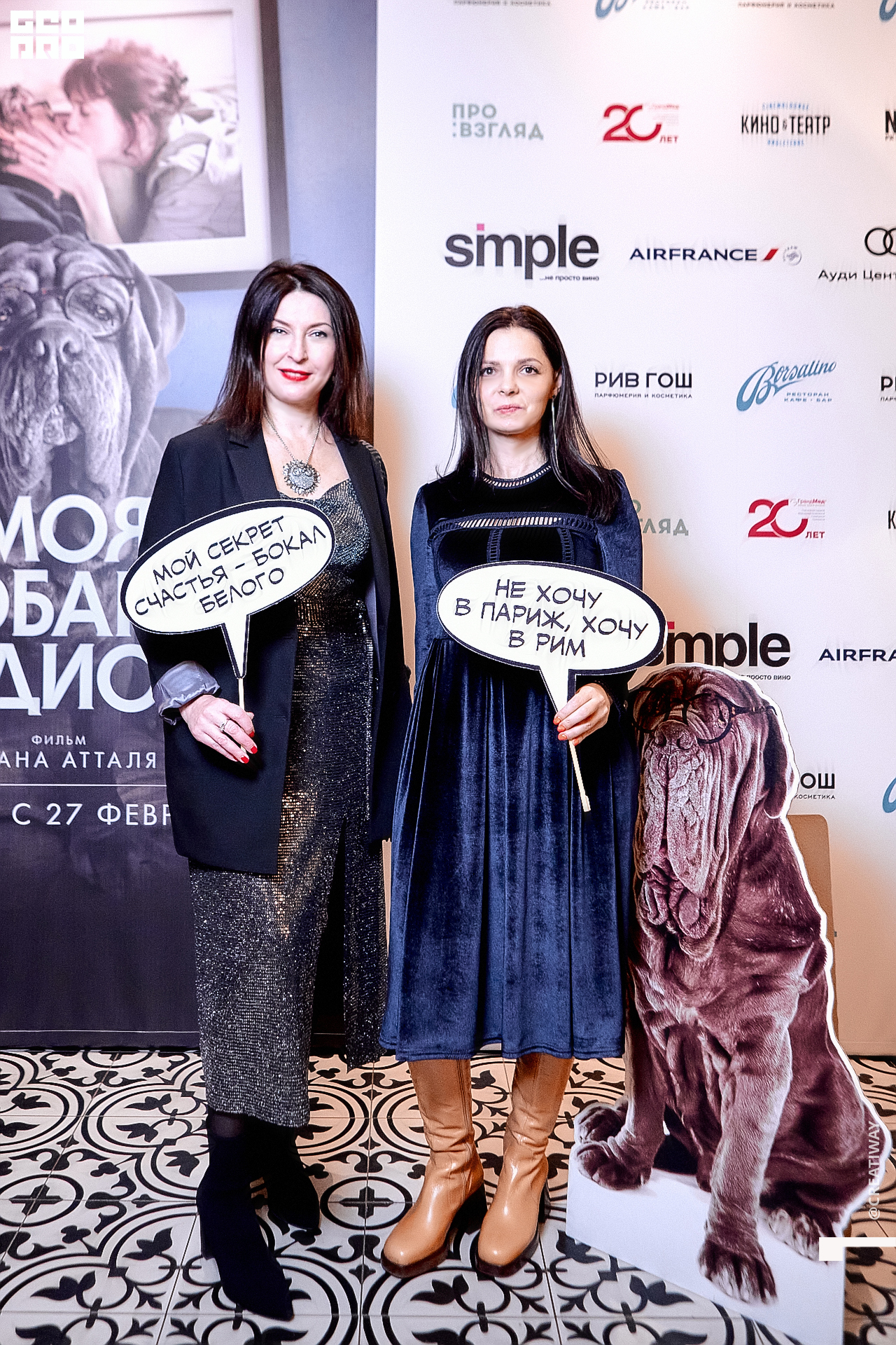 Специально для этого вечера компания Simple приготовила pop up коктейль "Моя собака идиот на основе белого вина, а ресторан Borsalino угощал лучшими закусками. благодаря кинопрокатной компании «Провзгляд» и поддержке авиакомпании AirFrance, Ауди Центра Петербург, сети магазинов парфюмерии и косметики РИВ ГОШ, клиники «ГрандМед», группе компаний Simple. В широкий прокат картина выйдет 27 февраля