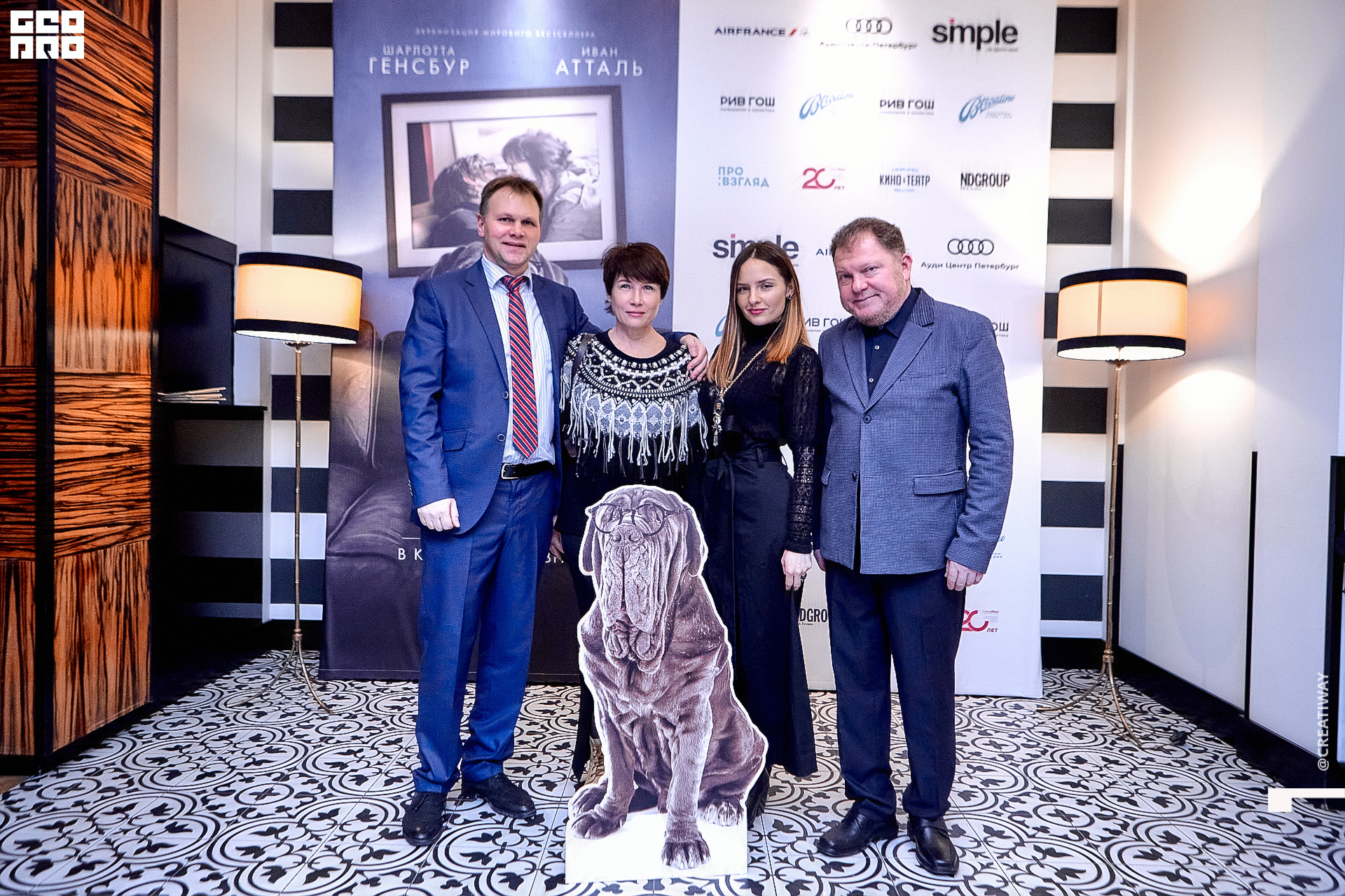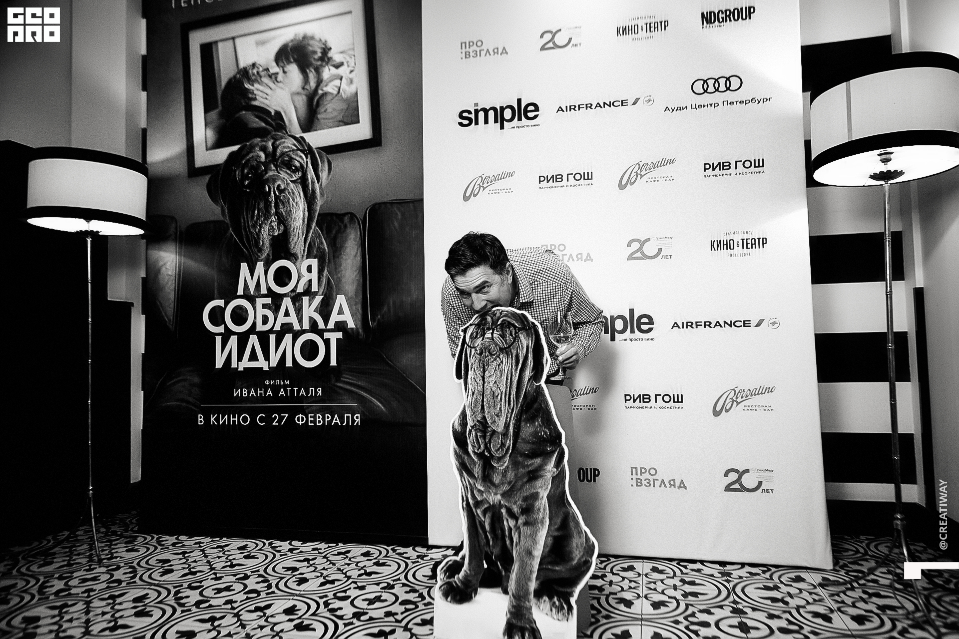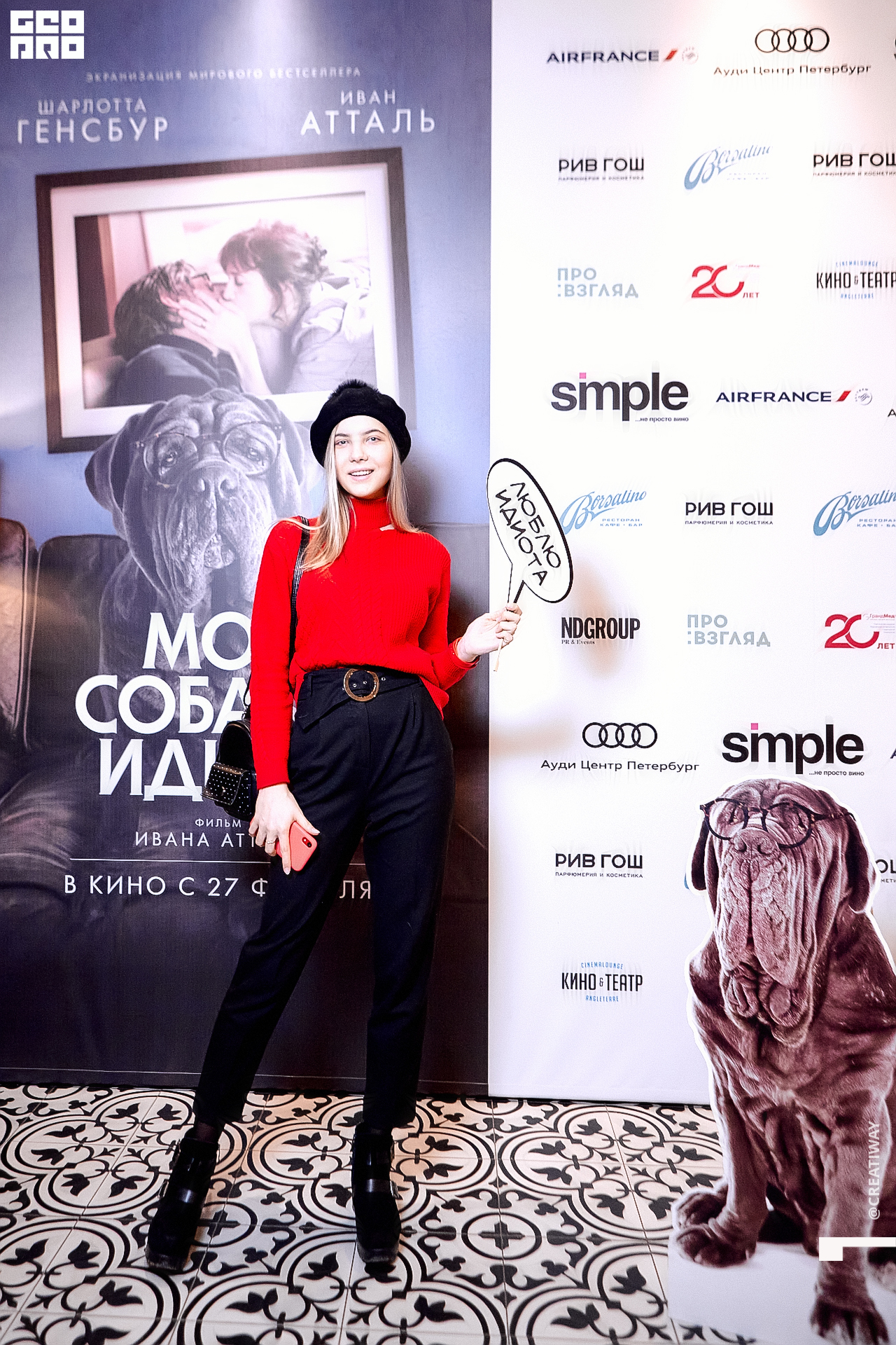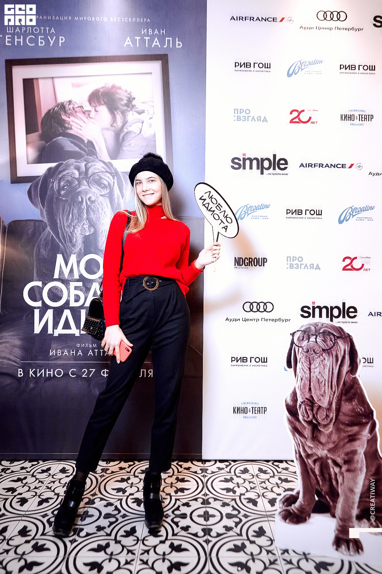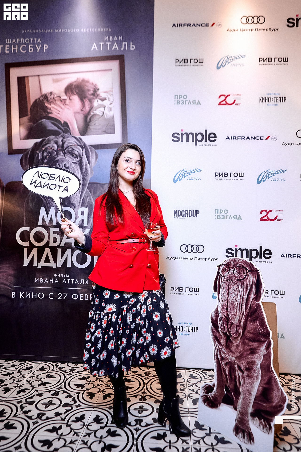 Специально для этого вечера компания Simple приготовила pop up коктейль "Моя собака идиот на основе белого вина, а ресторан Borsalino угощал лучшими закусками. благодаря кинопрокатной компании «Провзгляд» и поддержке авиакомпании AirFrance, Ауди Центра Петербург, сети магазинов парфюмерии и косметики РИВ ГОШ, клиники «ГрандМед», группе компаний Simple. В широкий прокат картина выйдет 27 февраля