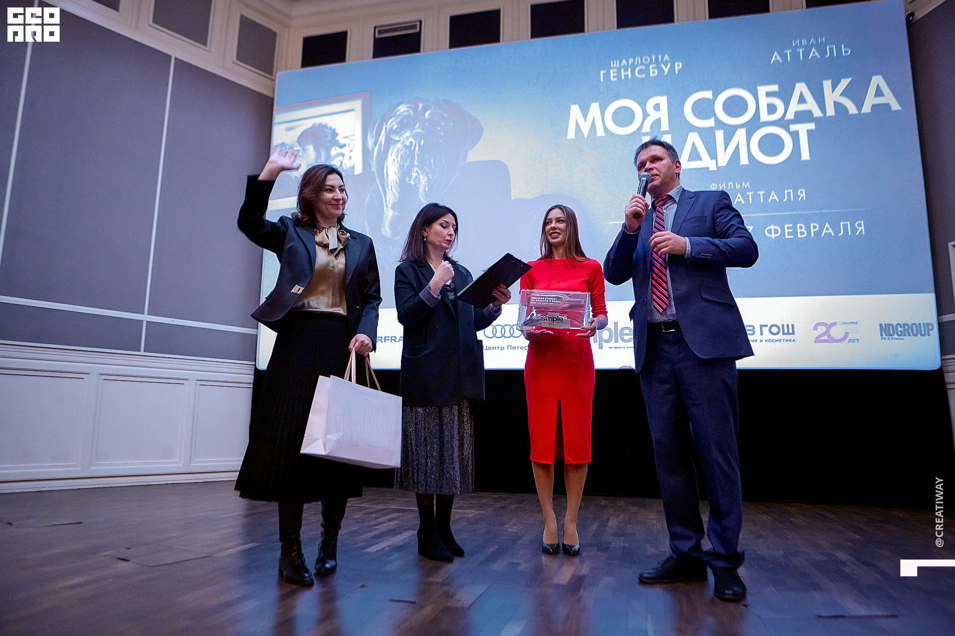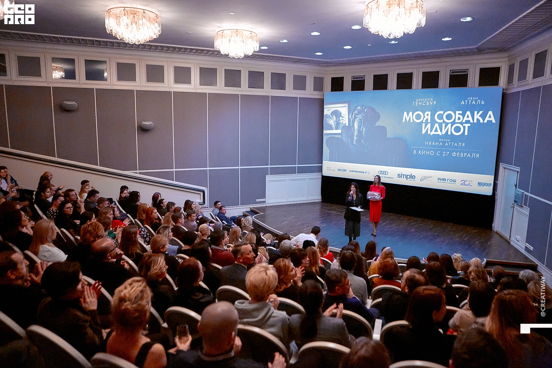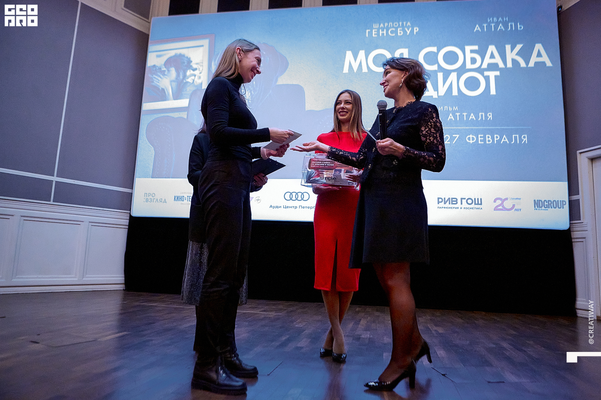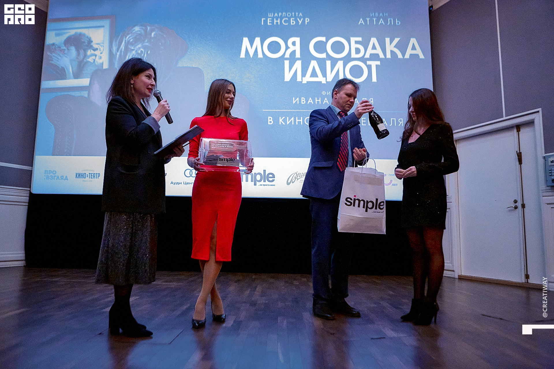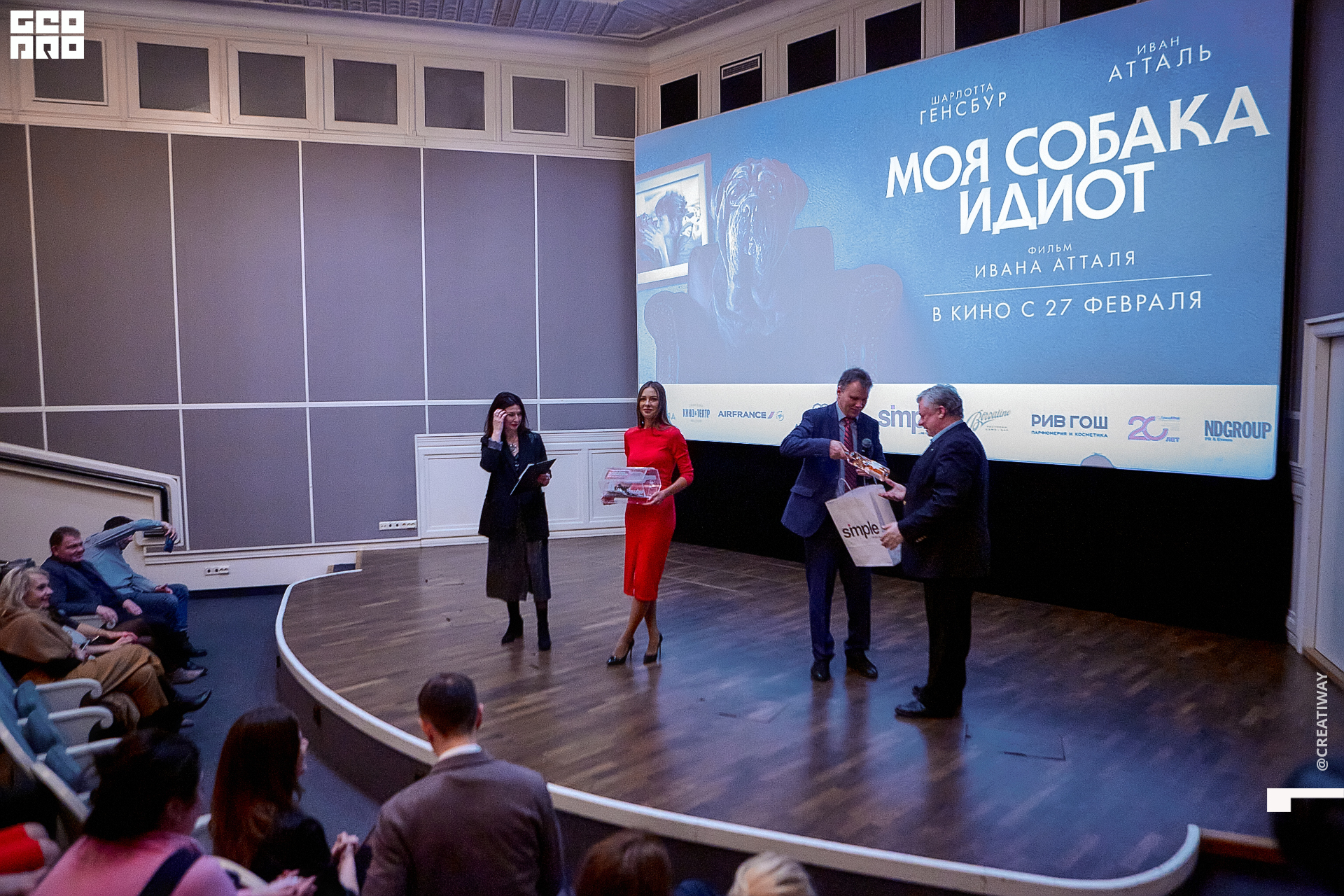 Специально для этого вечера компания Simple приготовила pop up коктейль "Моя собака идиот на основе белого вина, а ресторан Borsalino угощал лучшими закусками. благодаря кинопрокатной компании «Провзгляд» и поддержке авиакомпании AirFrance, Ауди Центра Петербург, сети магазинов парфюмерии и косметики РИВ ГОШ, клиники «ГрандМед», группе компаний Simple. В широкий прокат картина выйдет 27 февраля