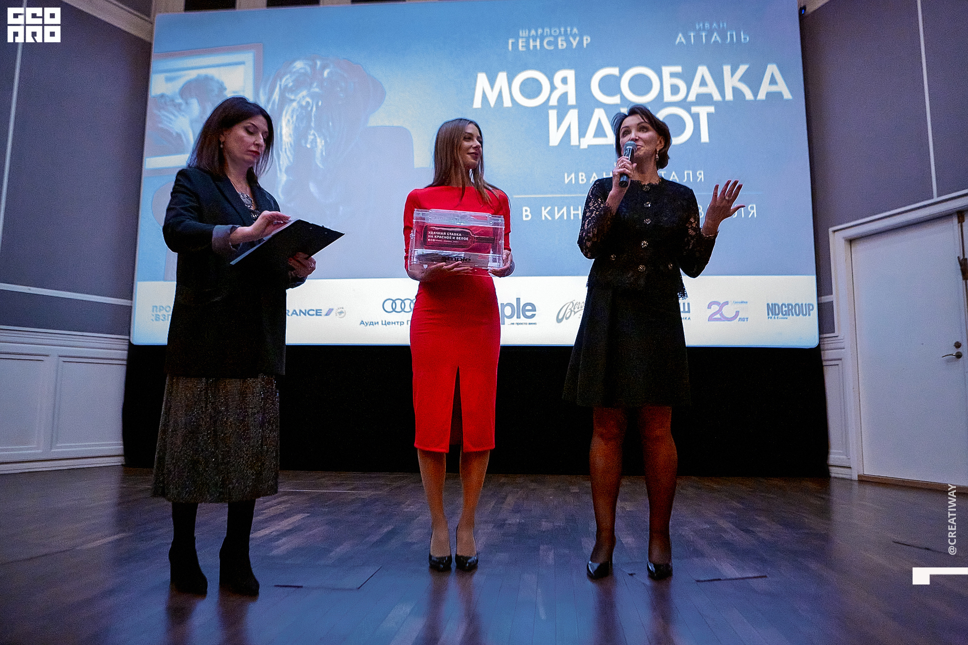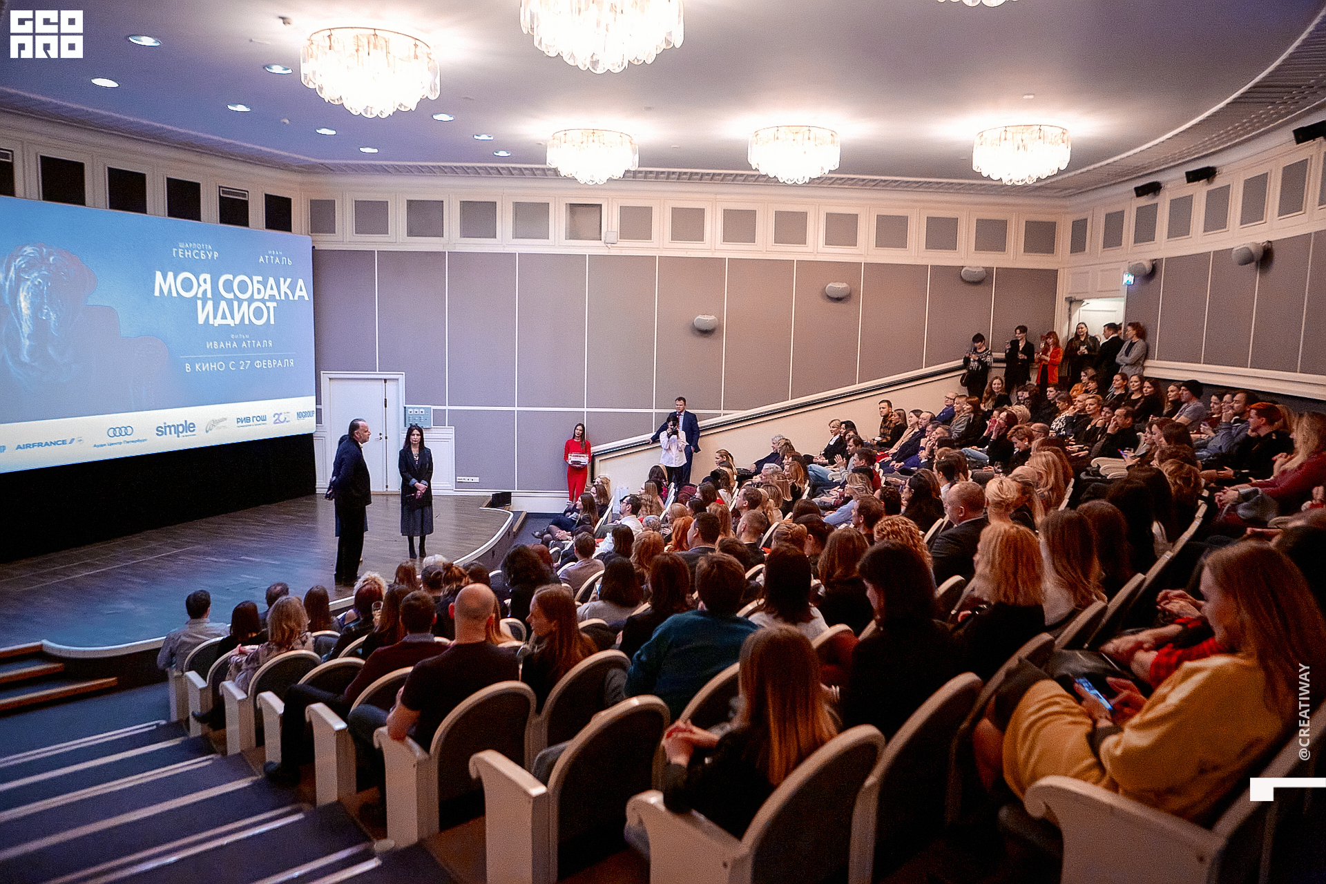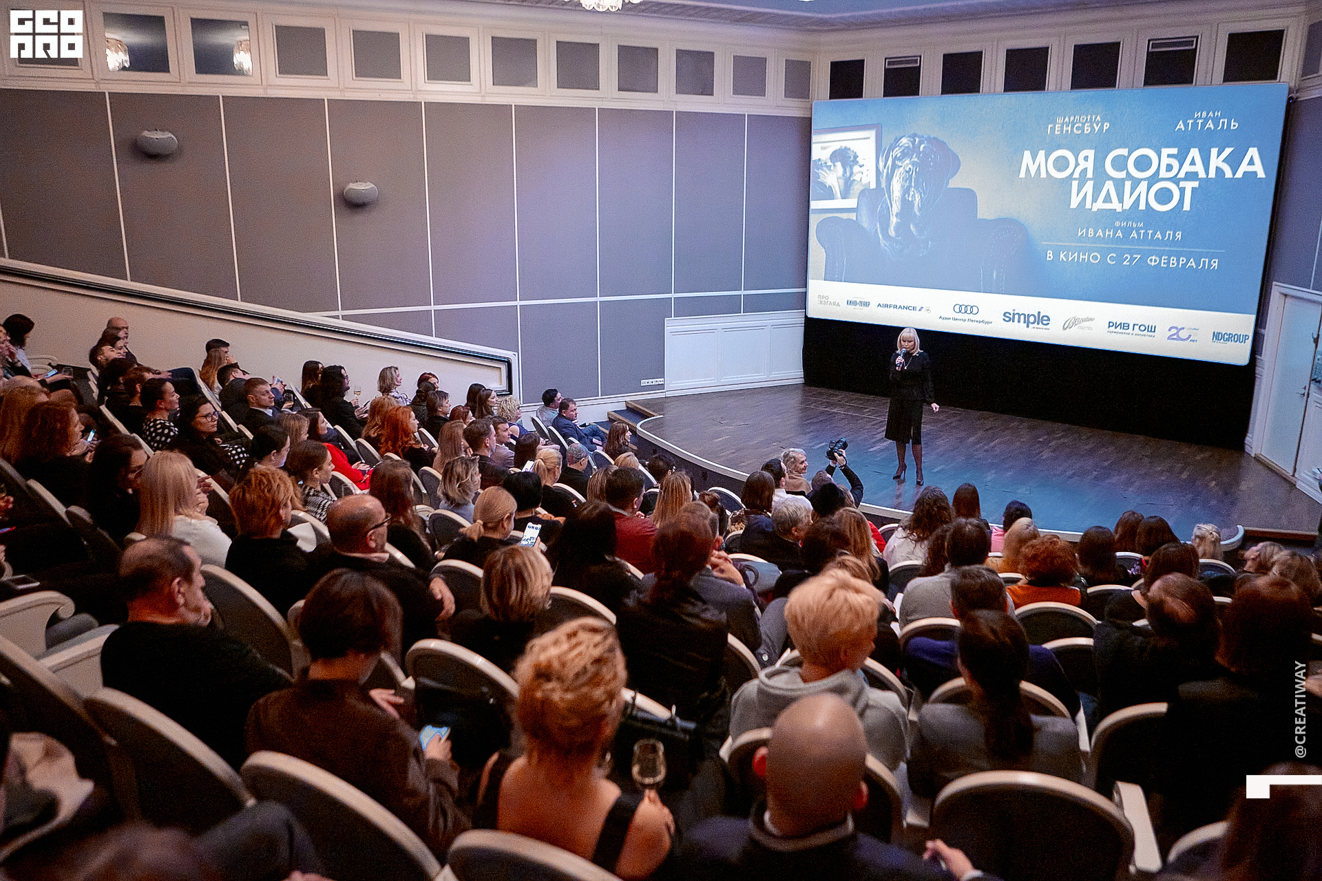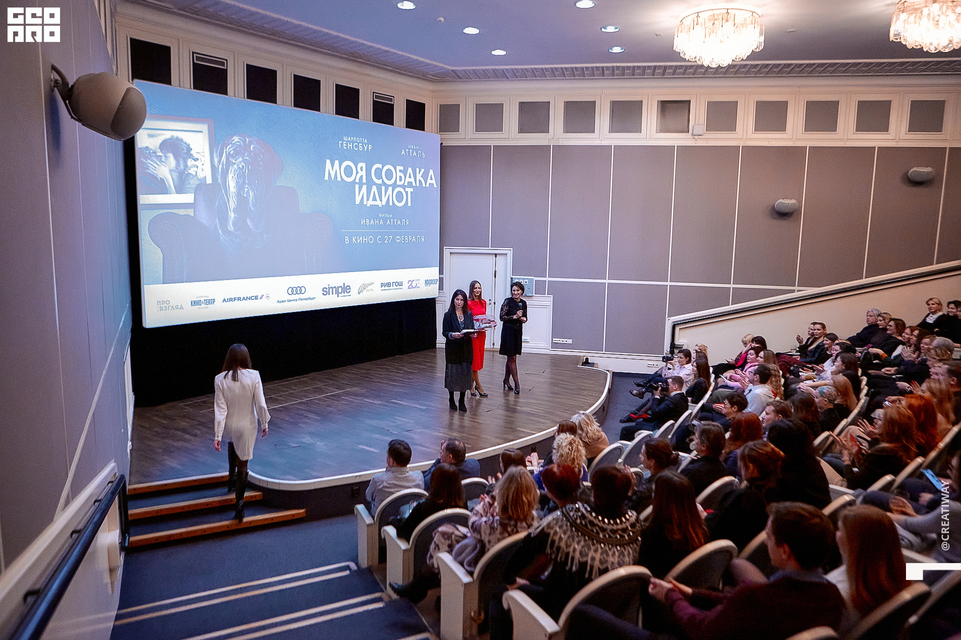Специально для этого вечера компания Simple приготовила pop up коктейль "Моя собака идиот на основе белого вина, а ресторан Borsalino угощал лучшими закусками. благодаря кинопрокатной компании «Провзгляд» и поддержке авиакомпании AirFrance, Ауди Центра Петербург, сети магазинов парфюмерии и косметики РИВ ГОШ, клиники «ГрандМед», группе компаний Simple. В широкий прокат картина выйдет 27 февраля