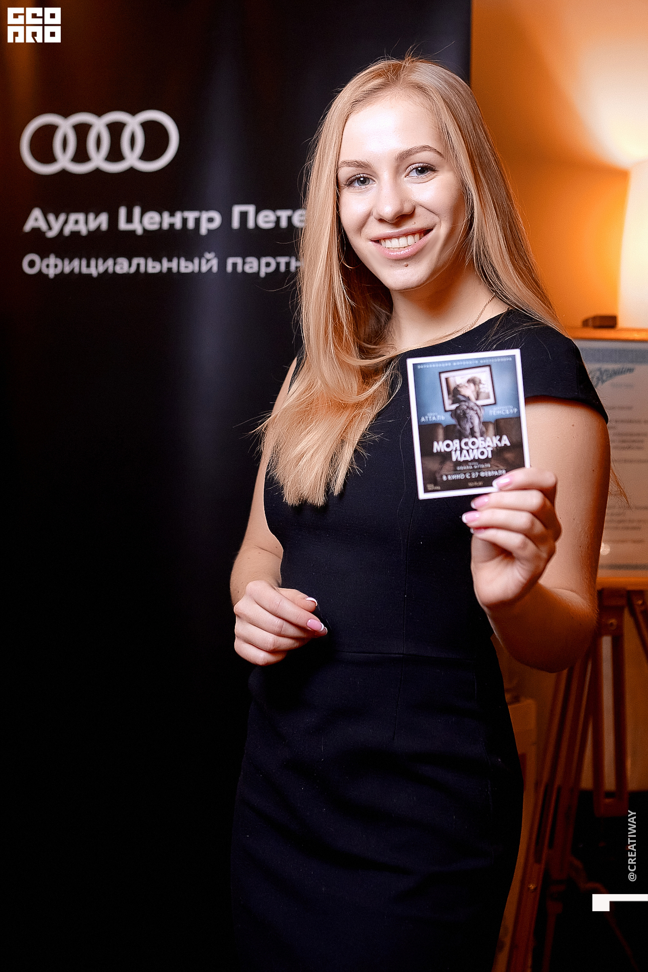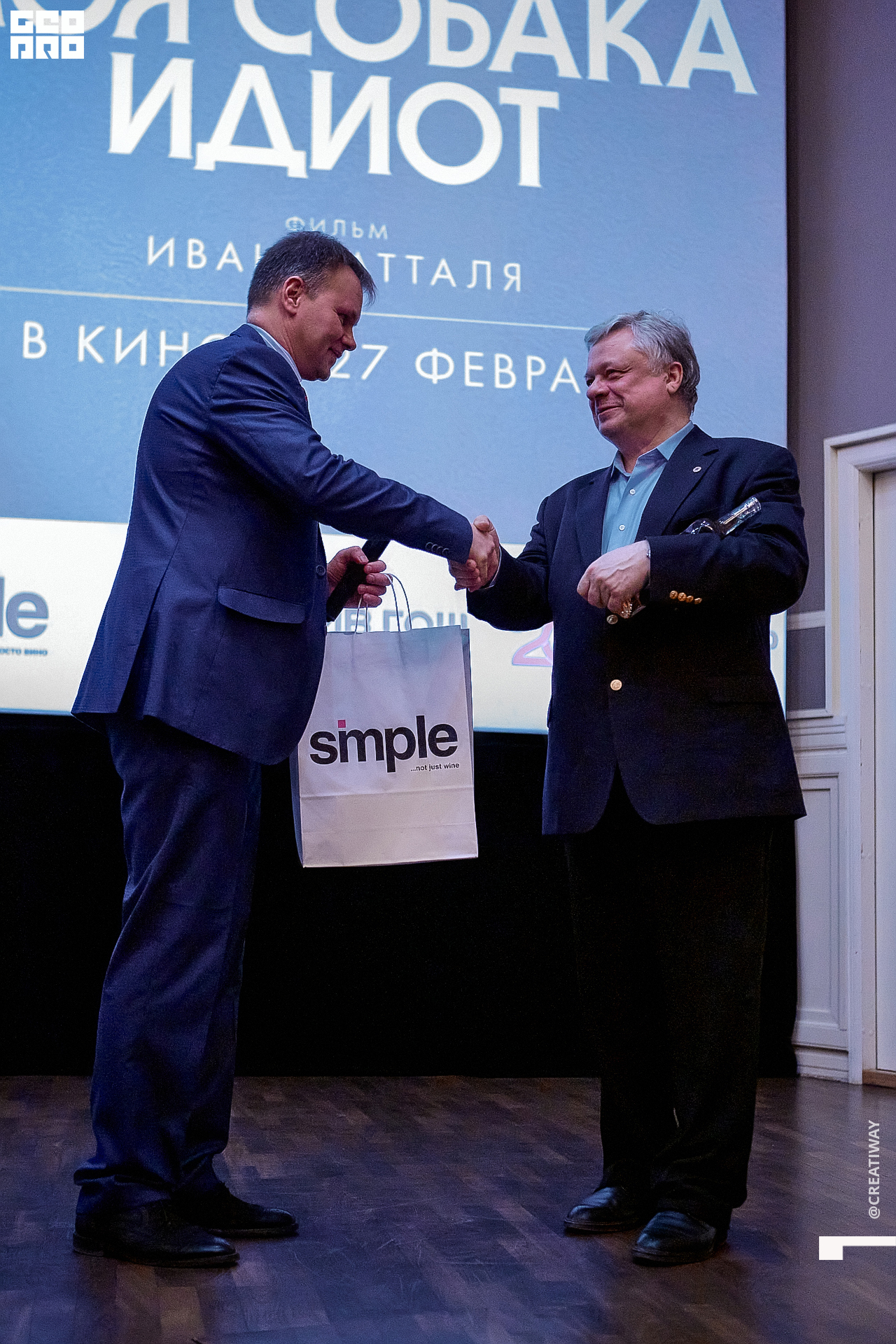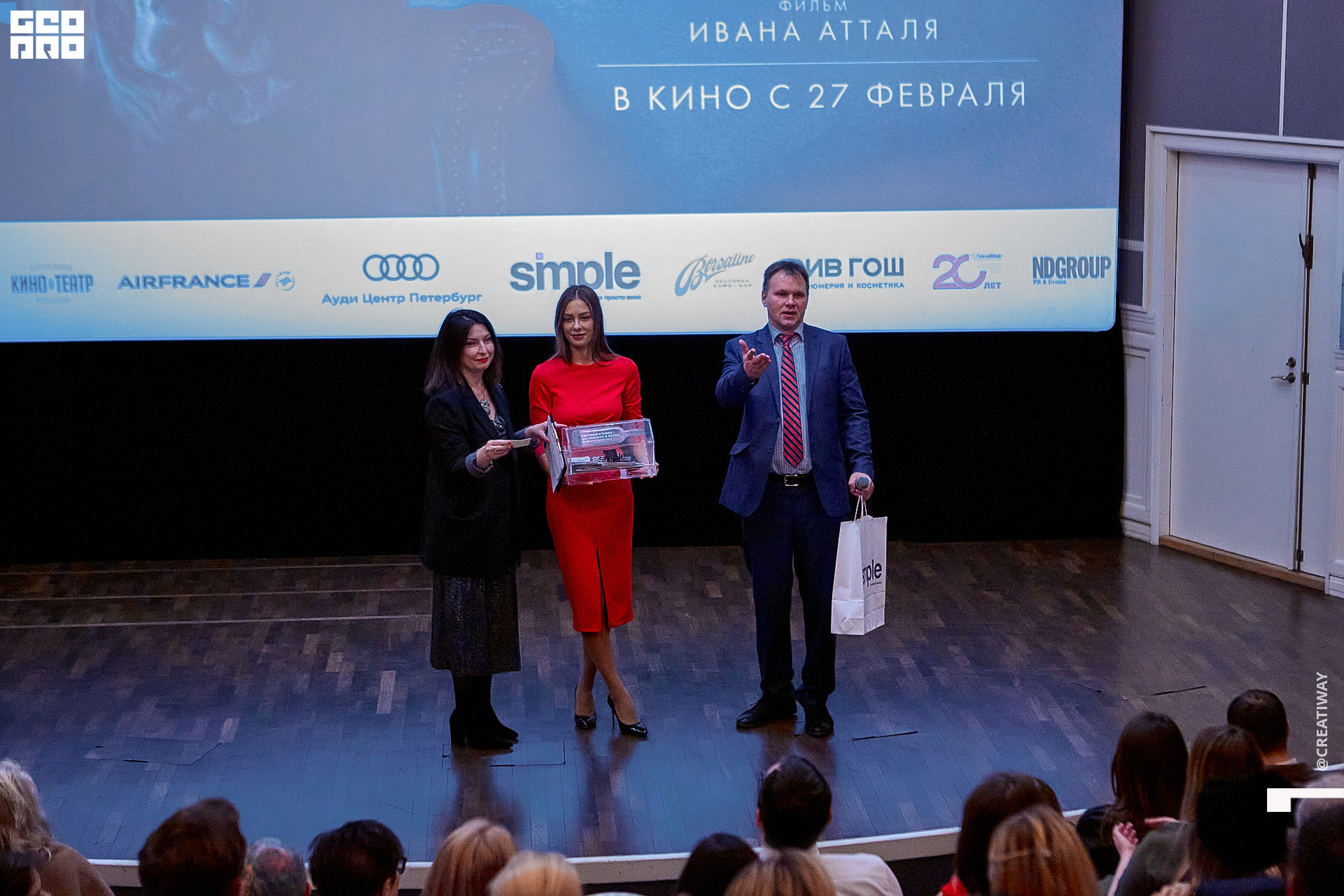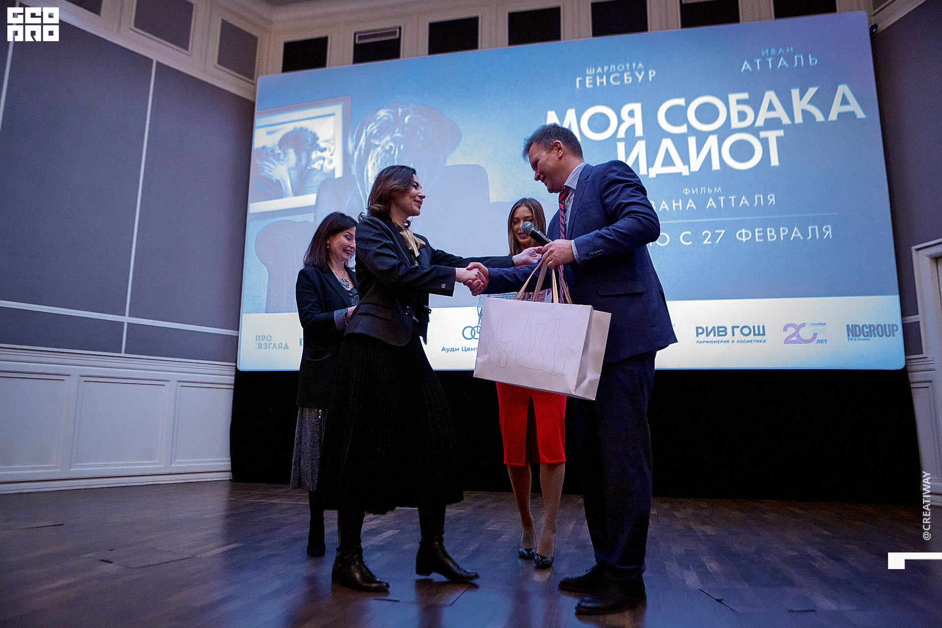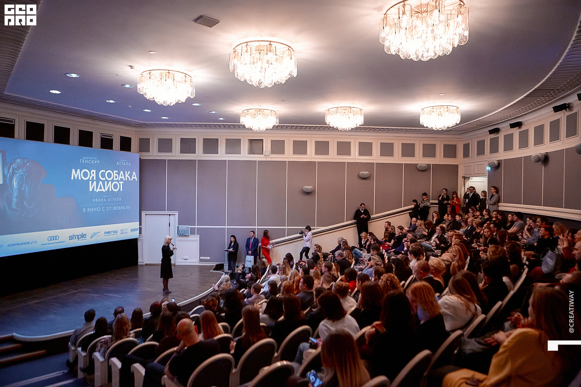Специально для этого вечера компания Simple приготовила pop up коктейль "Моя собака идиот на основе белого вина, а ресторан Borsalino угощал лучшими закусками. благодаря кинопрокатной компании «Провзгляд» и поддержке авиакомпании AirFrance, Ауди Центра Петербург, сети магазинов парфюмерии и косметики РИВ ГОШ, клиники «ГрандМед», группе компаний Simple. В широкий прокат картина выйдет 27 февраля