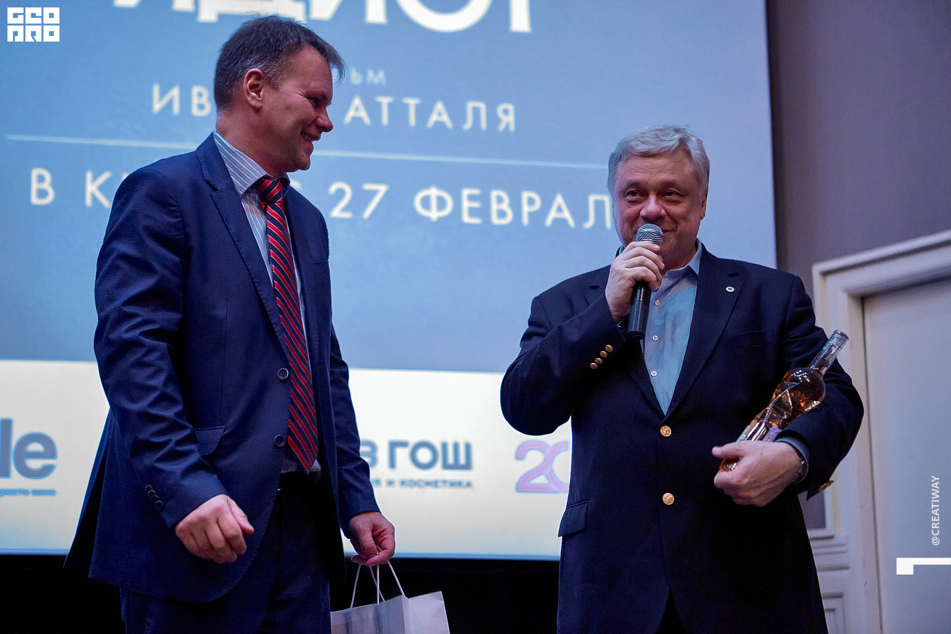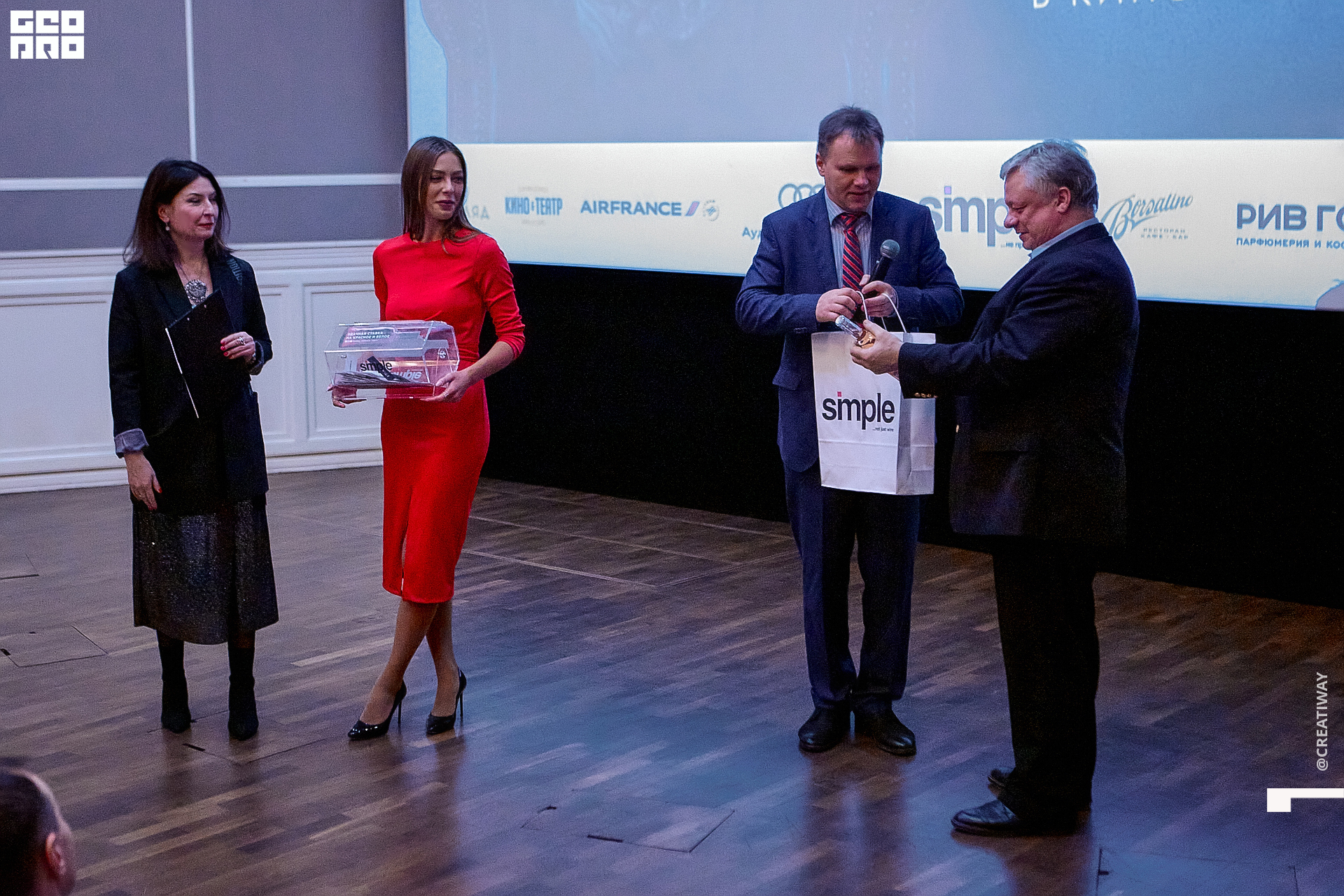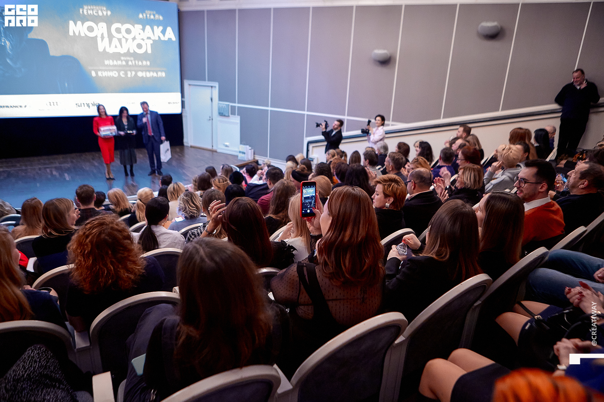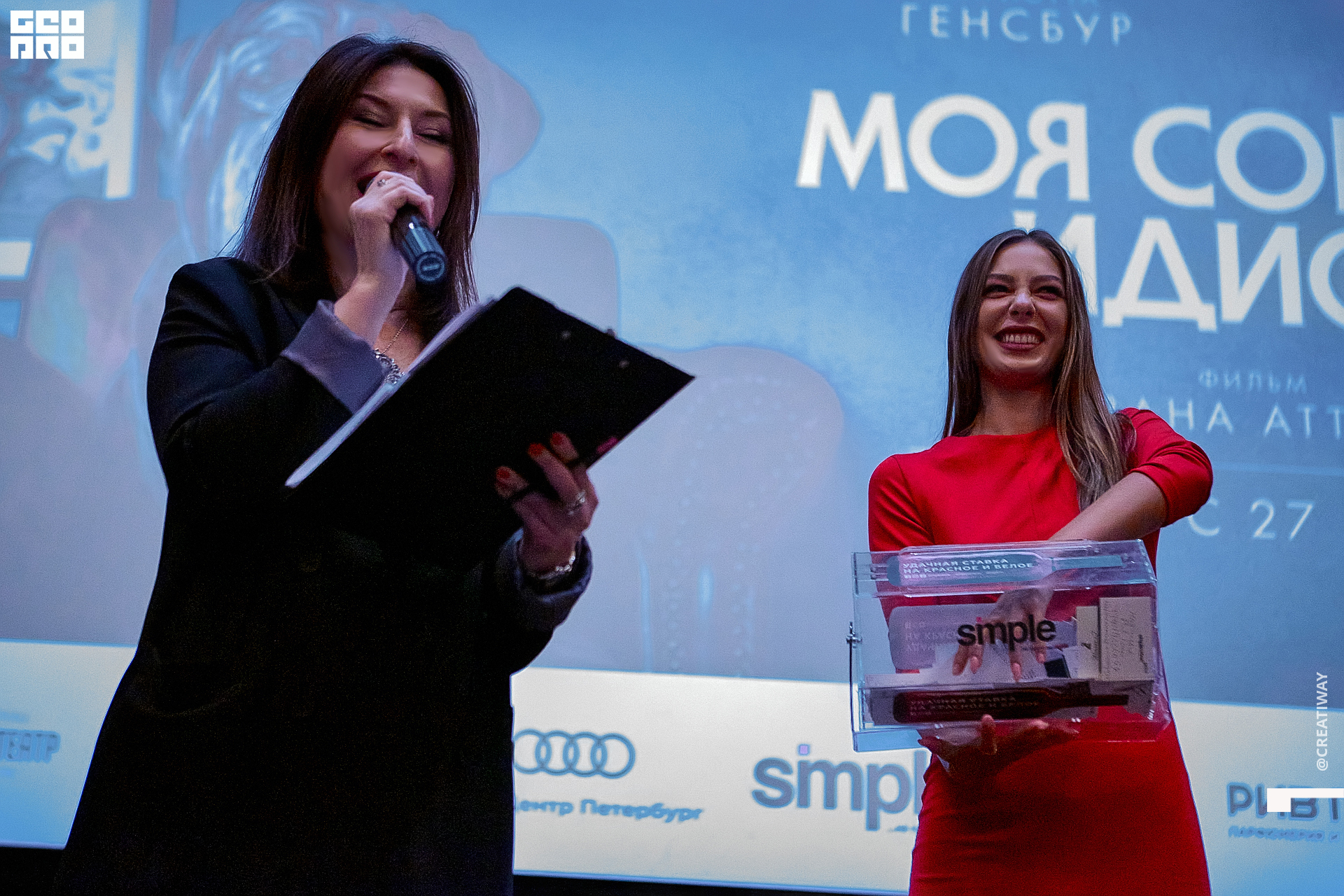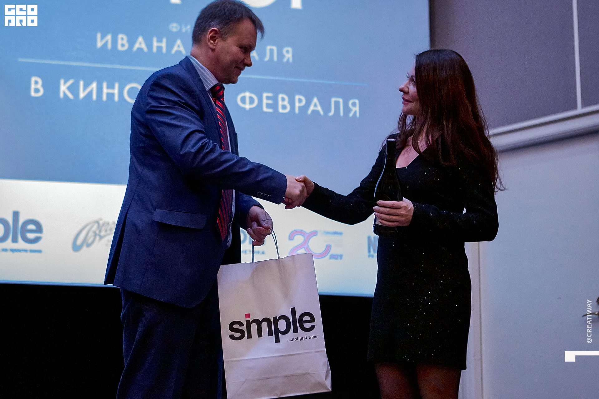 Специально для этого вечера компания Simple приготовила pop up коктейль "Моя собака идиот на основе белого вина, а ресторан Borsalino угощал лучшими закусками. благодаря кинопрокатной компании «Провзгляд» и поддержке авиакомпании AirFrance, Ауди Центра Петербург, сети магазинов парфюмерии и косметики РИВ ГОШ, клиники «ГрандМед», группе компаний Simple. В широкий прокат картина выйдет 27 февраля
