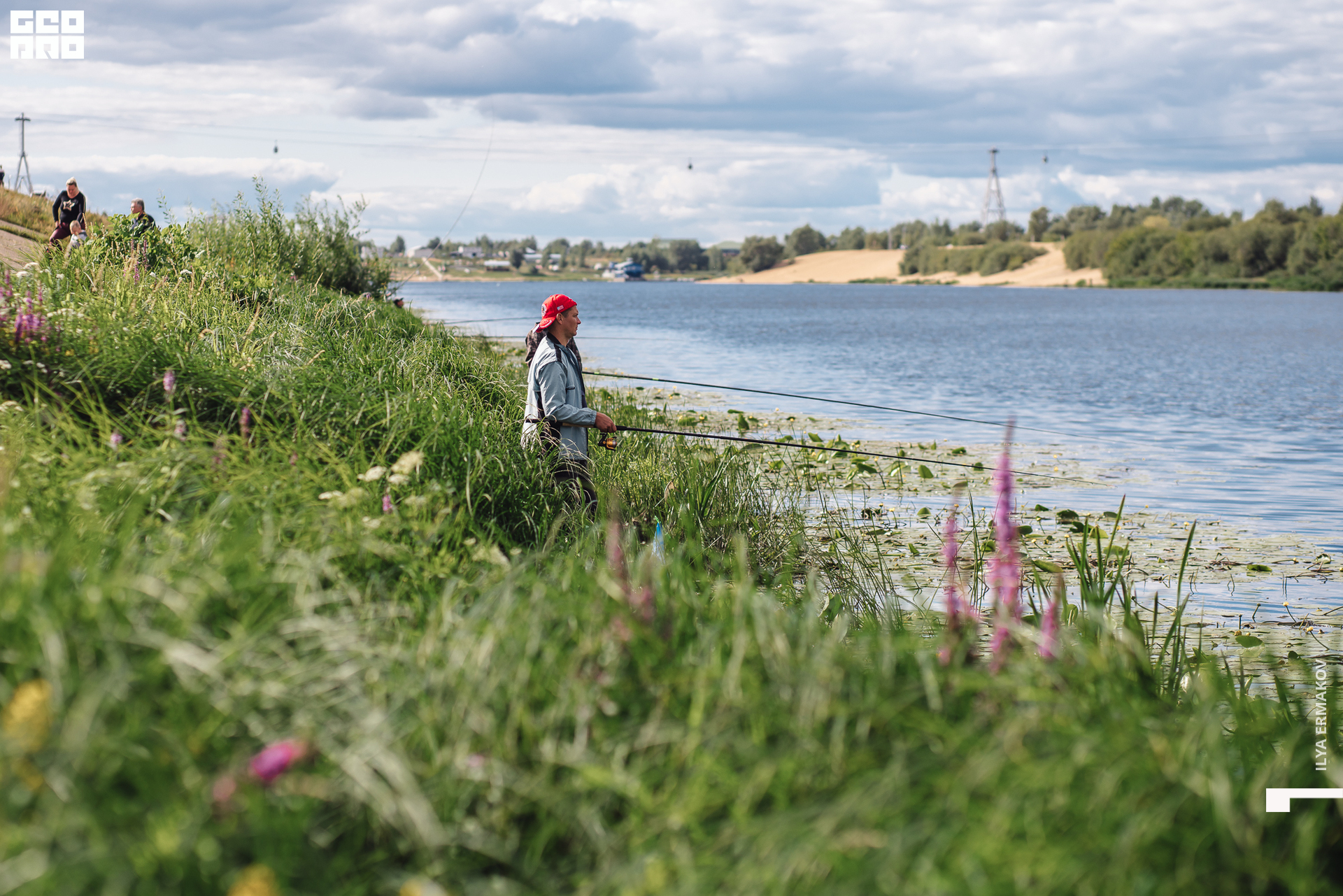 На набережной Гребного канала рыбаки показывали своё мастерство рыбной ловли, рассредоточившись по берегу реки.
